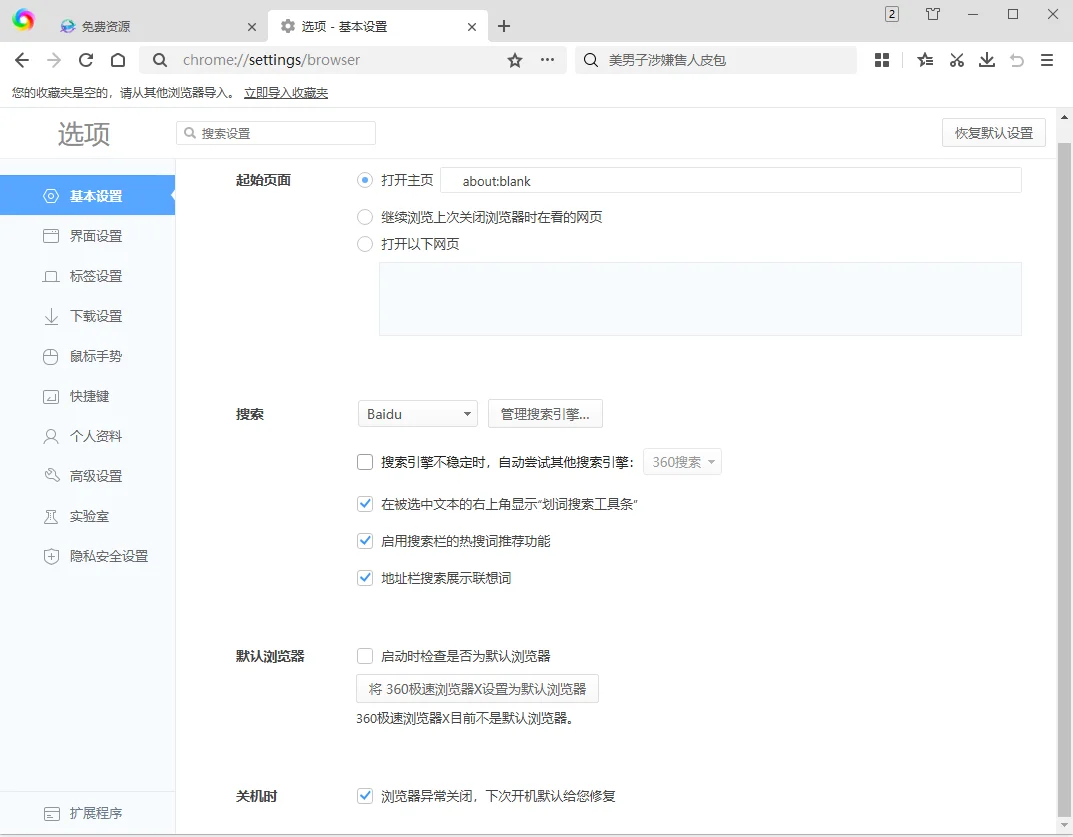 - 首次启动时,浏览器将使用空白主页,可根据需要自定义