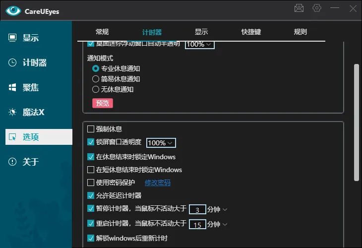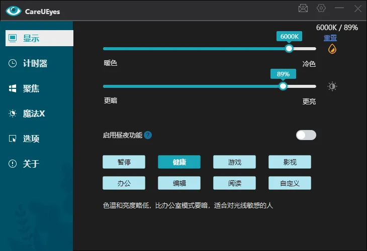 作为一款功能强大的护眼工具,CareUEyesPro无需复杂设置即可自动适应不同环境光线,提供个性化的护眼方案,让用户在长时间工作或娱乐时保持舒适的视觉体验。