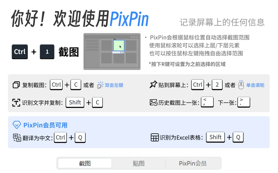 PixPin是一款围绕截图贴图设计的实用型应用,主要用于解决用户在屏幕截图与图片处理中的实际需求。作为一款国产截图+贴图效率工具,它将截图、贴图、长截图、GIF录制、OCR文字识别、图片标注六大高频需求整合在同一套快捷操作中,支持Windows和macOS双平台使用。软件绝大部分功能免费,同时提供会员服务,会员可使用部分专属功能。