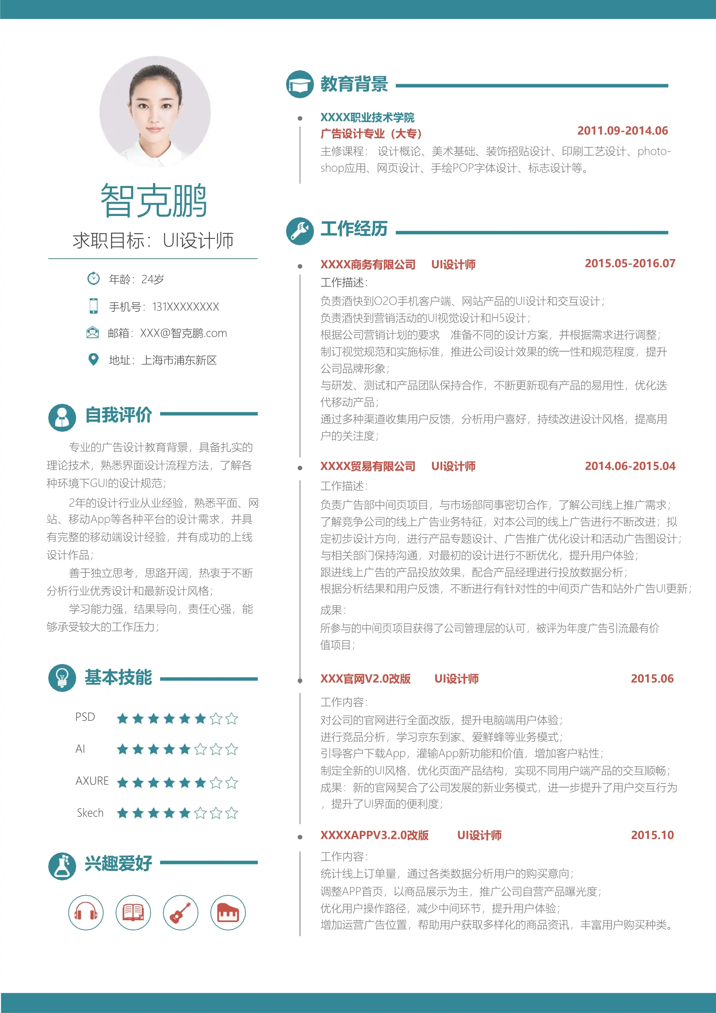 UI设计师专属单页简历模板,主打青绿白配色,采用双栏的核心布局,左侧呈现个人信息、自我评价、基本技能与兴趣爱好,右侧展示教育背景与工作经历,搭配星级技能评分与图标增强视觉表现力,贴合招聘者快速阅读习惯,精准捕捉核心信息。解决简历信息杂乱、重点不突出问题,适配UI设计、交互设计、视觉设计行业,大专及相关经验求职者通用。