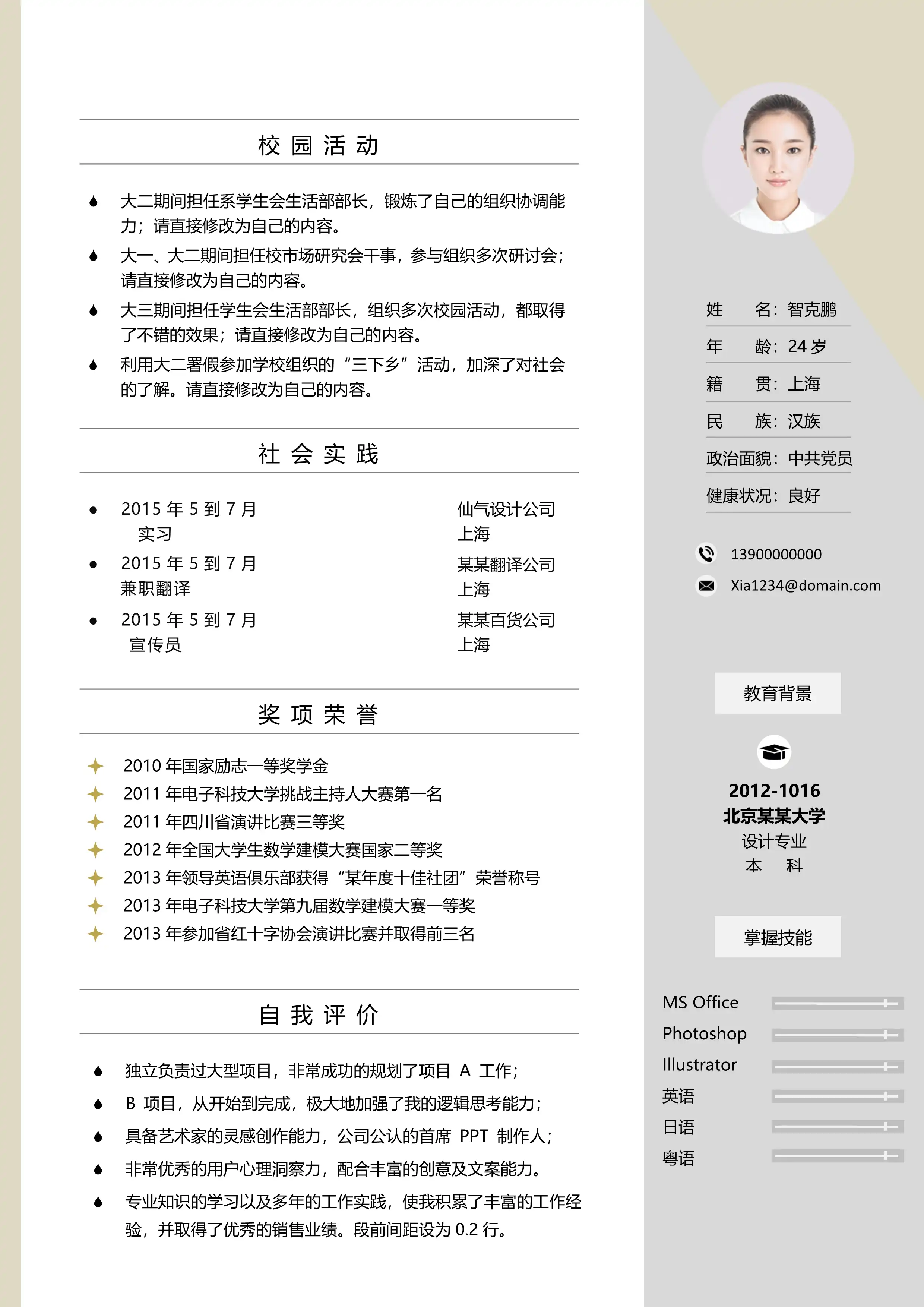 雅致极简风单页简历模板,主打米灰配色,采用双栏的核心布局,左侧呈现校园活动、社会实践、奖项荣誉与自我评价,右侧展示个人信息、教育背景与掌握技能,采用细线分割与进度条增强视觉表现力,贴合招聘者快速阅读习惯,精准捕捉核心信息。解决简历信息杂乱、重点不突出问题,适配设计、创意、商务行业,本科及相关经验求职者通用。